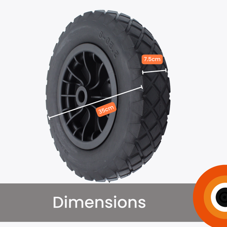 DURABLE & PUNCTURE PROOF – Made from high-quality PU solid rubber, this 350mm (14") wheelbarrow wheel is completely puncture-proof and built to last. It delivers a smooth ride over gravel, soil, and uneven ground—no risk of flats or deflation.