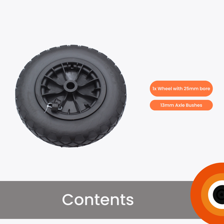 Upgrade your trolley or wheelbarrow with this 14" (350mm) puncture-proof replacement wheel. Built with a solid PU tyre and rust-proof black plastic rim, it’s maintenance-free, durable, and designed to handle heavy-duty use. The 13mm bore fits most standard axles, offering a quick and hassle-free replacement for garden, workshop, or site use.