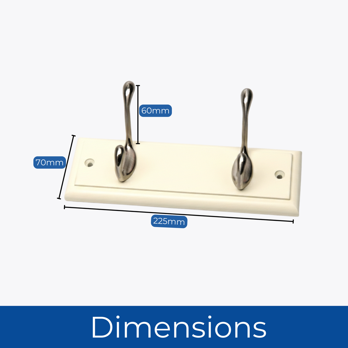 DIMENSIONS - Board 22.5cm (L) x 7cm (H) x 1.6cm (D); Overall inc hooks - 22.5cm (L) x 9.5cm (H) x 7.5cm (D); SPACINGS - Hooks 11.2cm; Mounting holes 16cm