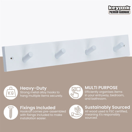 The Keypak Wooden Coat Rack is the perfect solution for organizing your space with both style and function. Featuring four sturdy hooks, this wall-mounted rack offers greater capacity than similar-sized alternatives, holding up to 20 kg, making it ideal for coats, jackets, bags, towels, and more. Designed for easy installation, this rack comes with simple instructions, a mounting template, and premium fixings, ensuring a quick and hassle-free setup. The concealed fixings on the back provide a clean, modern look while protecting your clothes from snags. Dimensions -Rail Size: W46cm x 7cm Crafted from durable bamboo, this coat rack complements both classic and contemporary interiors, offering a versatile addition to any room. Built with high-quality materials, it ensures long-lasting reliability and durability, providing a practical and elegant storage solution for years to come.