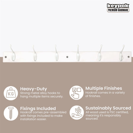 Ideal for family homes or high-traffic spaces, the Keypak 6-hook wall-mounted coat rack adds sleek organisation to any room. Featuring six double hooks on a 69cm white wooden board, this rack is perfect for hanging everything from jackets to towels. Its modern design fits seamlessly into minimalist, coastal, or Scandinavian interiors, offering both style and practical everyday use.