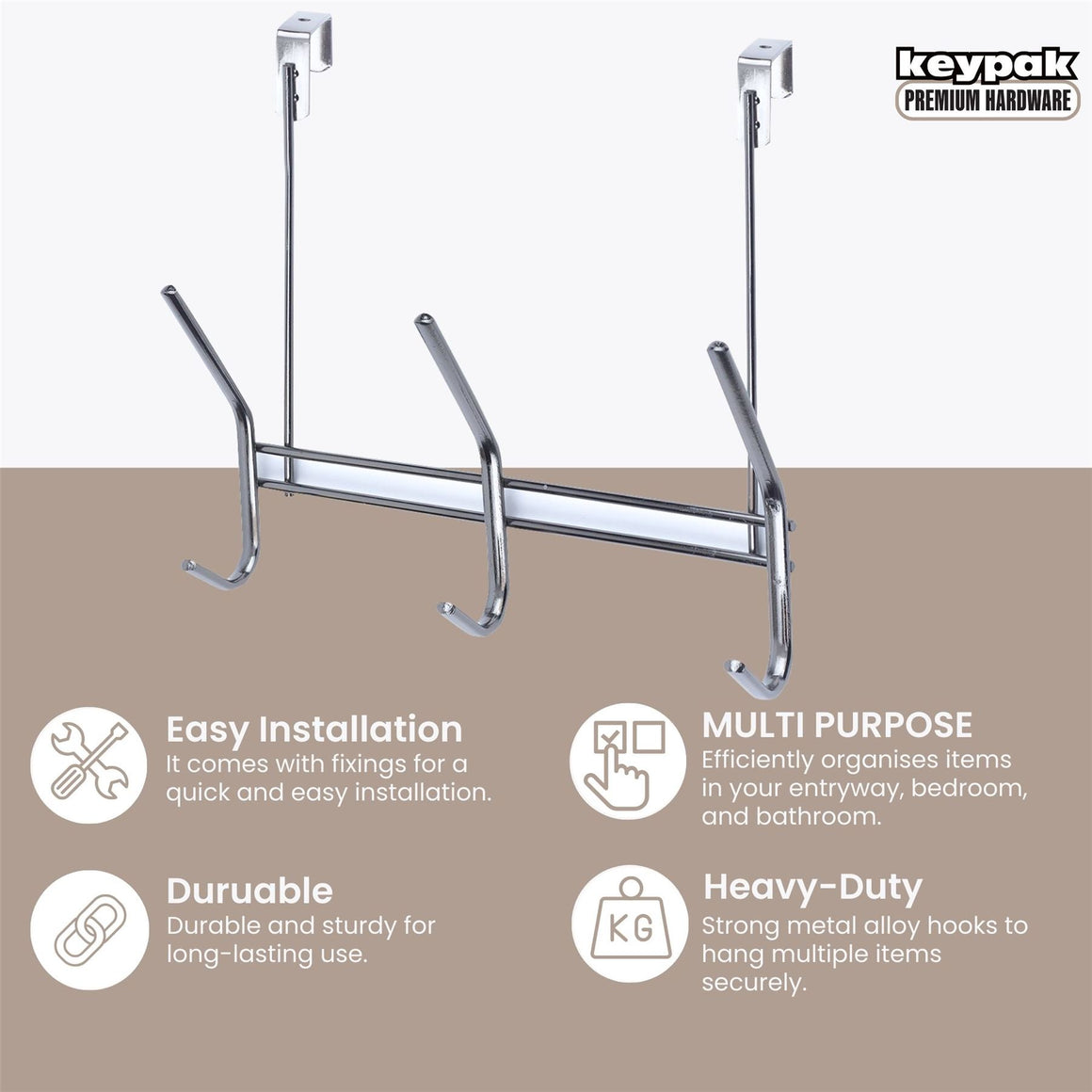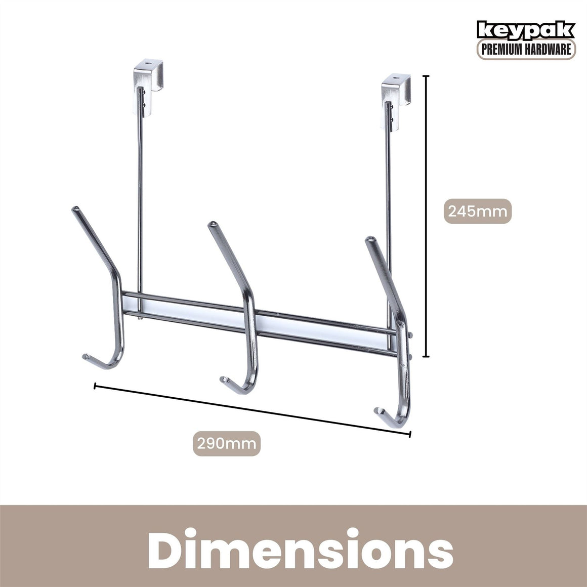 The Keypak Triple Over Door Hanger offers instant organisation with a polished chrome finish that elevates any interior. Featuring three double hooks, this 29cm-wide rack is ideal for hanging coats, towels, scarves or bags without drilling into walls. The sleek profile tucks over standard doors with ease, offering a discreet yet efficient solution for busy homes, student rooms or bathrooms. Designed to blend durability and elegance, this versatile hook system delivers clutter control where you need it-no tools required.
