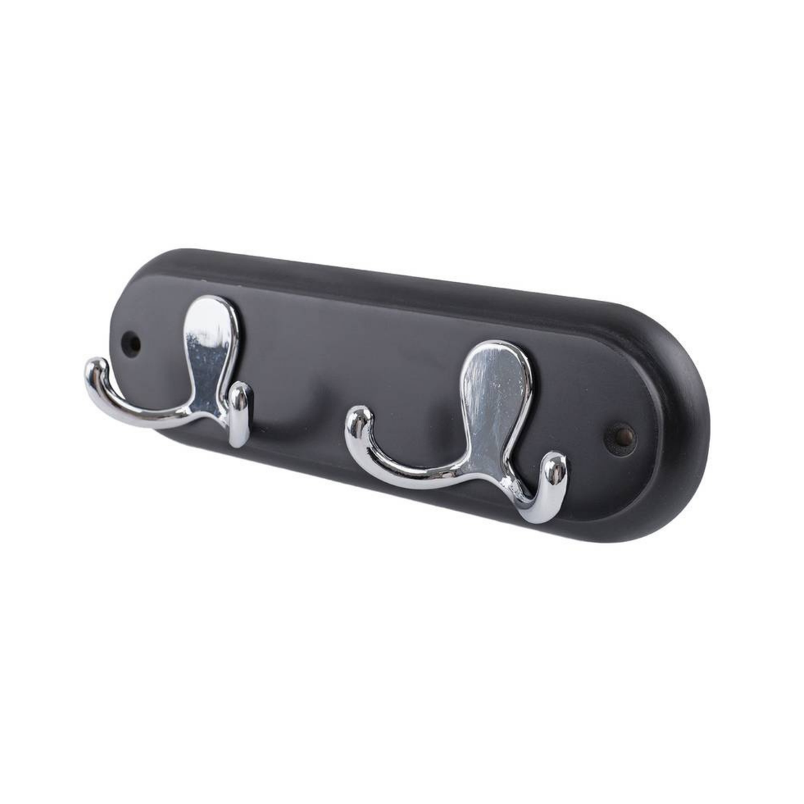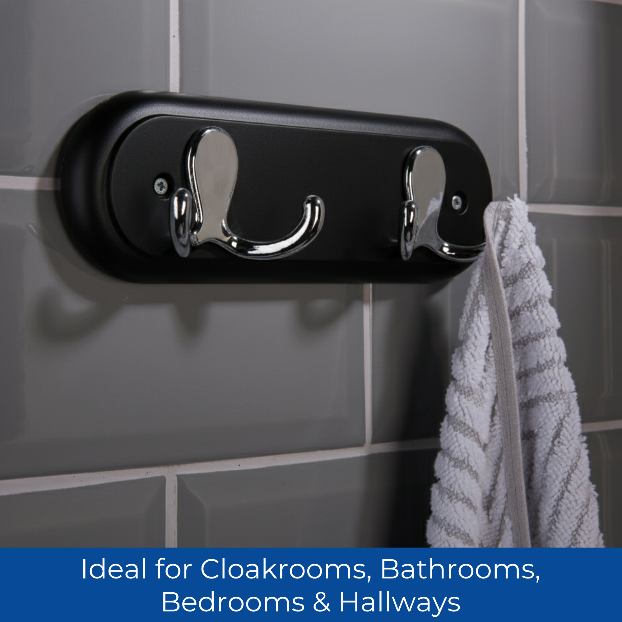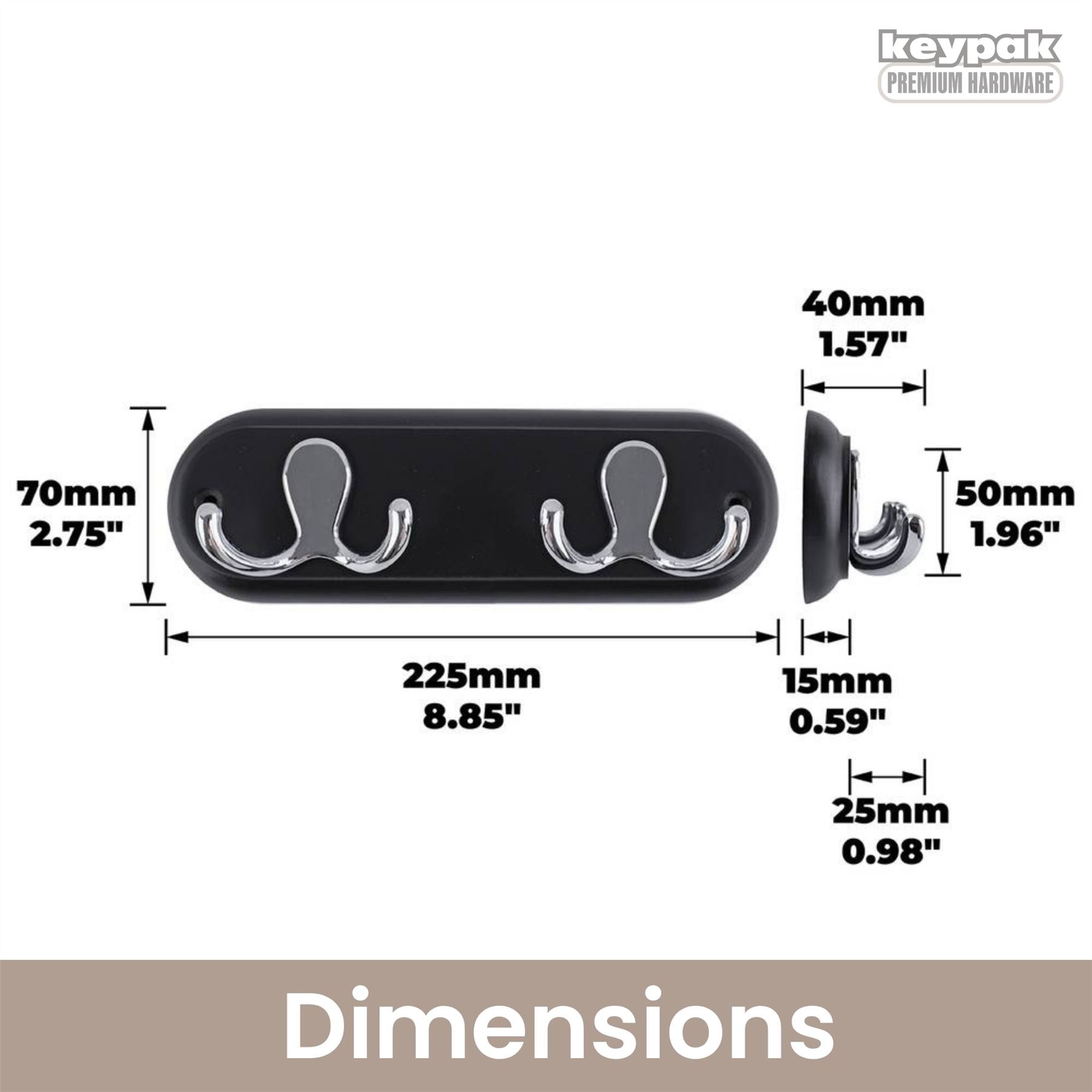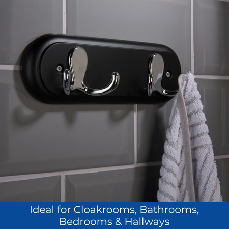 STYLISH & SPACE-SAVING: Compact 22.5cm black board with two polished chrome double hooks, ideal for hanging coats, jackets, hats, robes, dressing gowns, bags and towels.