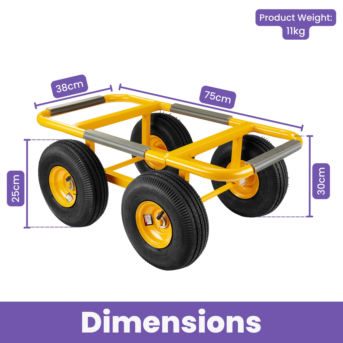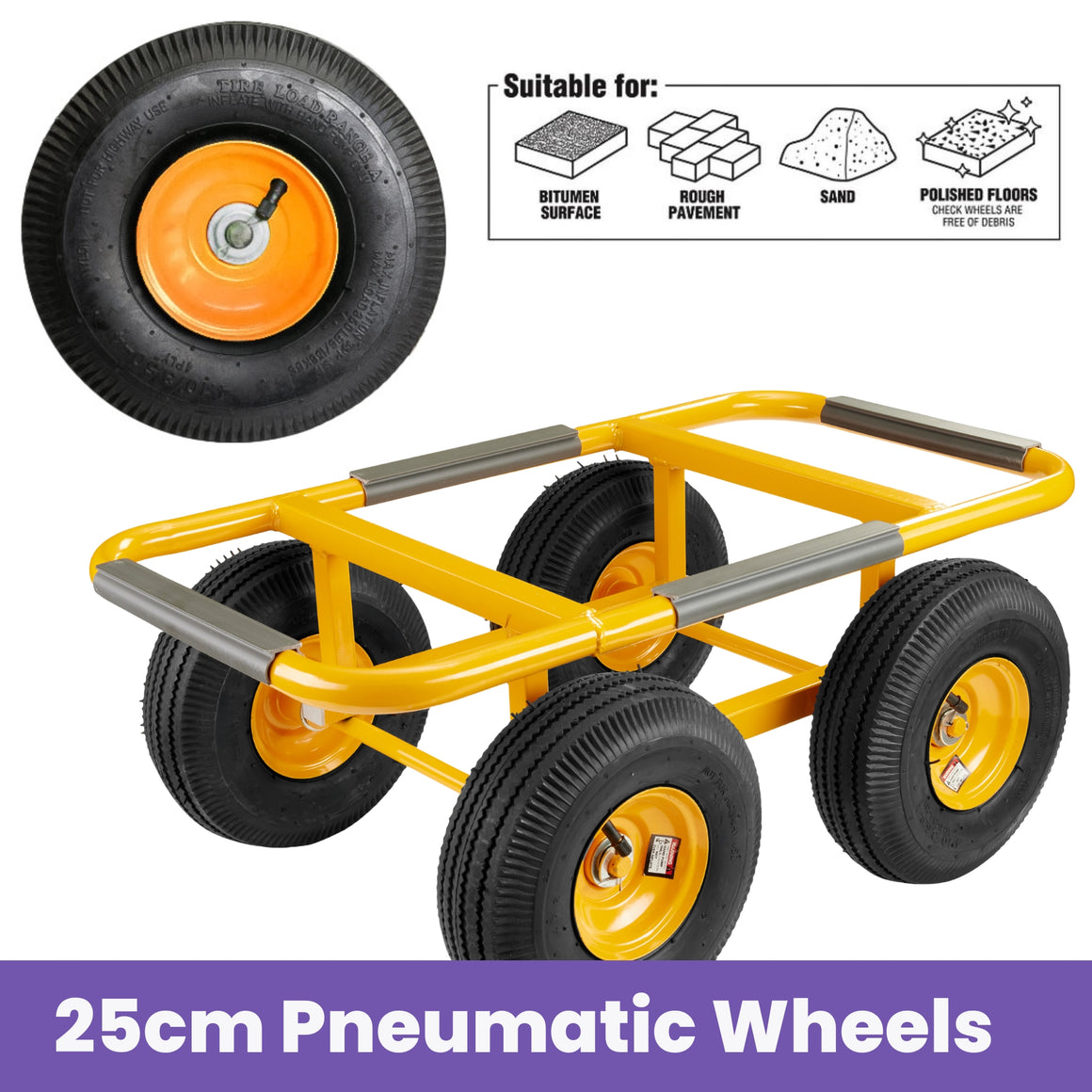 Equipped with 250mm pneumatic wheels, the dolly glides smoothly across a variety of terrains, from hardwood floors to uneven outdoor surfaces. Its fully welded, heavy-duty steel frame provides exceptional strength and durability, ensuring reliable performance even under the heaviest of loads.