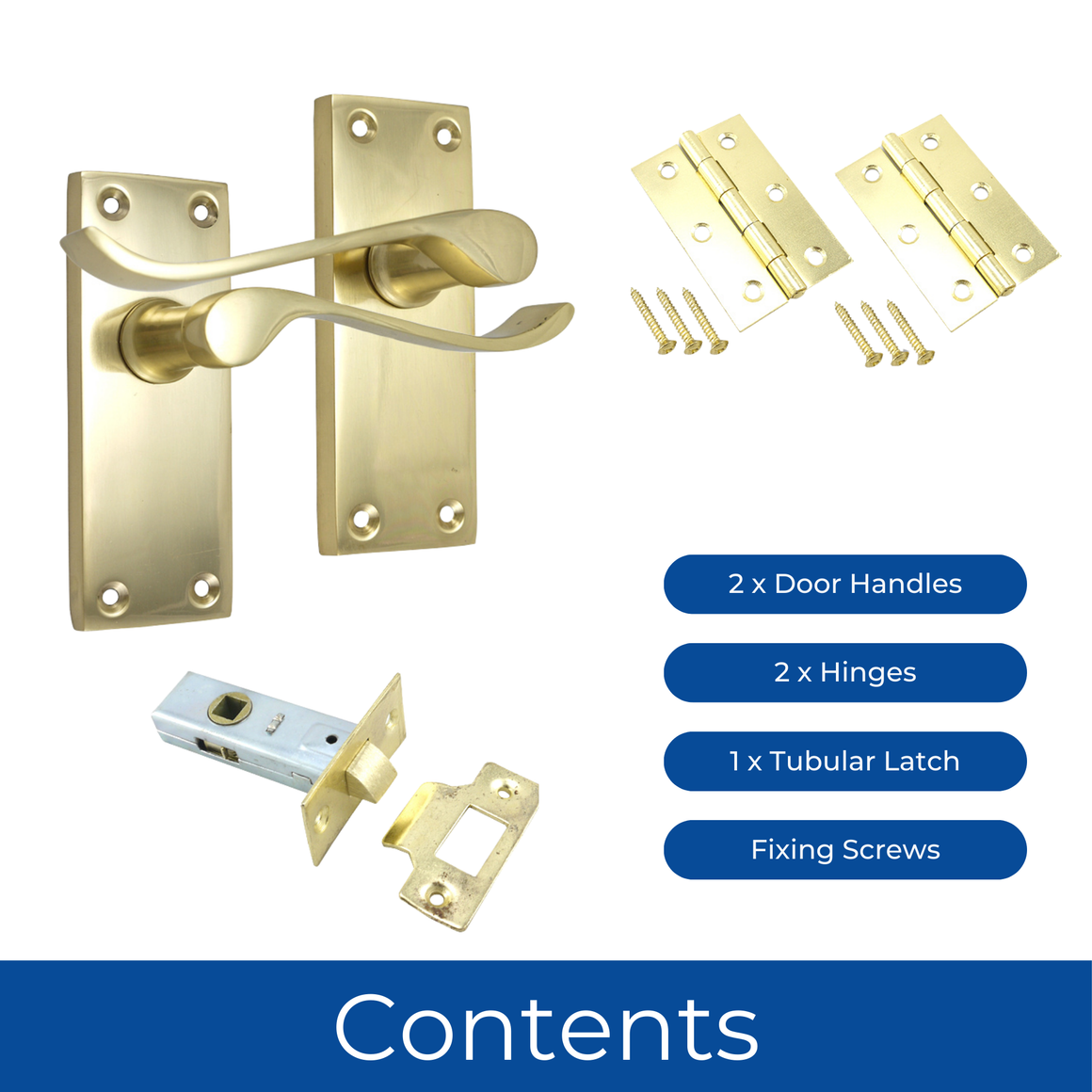 COMPLETE VICTORIAN-STYLE HANDLE SET Transform your interior doors with this complete Victorian-style handle set. The elegant 112mm scroll latch handles feature a classic design that adds a touch of period charm to any room. ALL-INCLUSIVE INSTALLATION KIT This comprehensive door pack includes everything needed for installation - a pair of handles with backplates, hinges, tubular latches, spindle, and all necessary fixings. The brass finish offers timeless appeal while maintaining durability for daily use. PERFECT FOR WOODEN INTERNAL DOORS Perfect for wooden internal doors, these handles combine decorative aesthetics with practical functionality. The complete set ensures hassle-free installation with all components perfectly matched. VERSATILE DESIGN The traditional scroll design complements both contemporary and classic interior styles, making it a versatile choice for home improvement projects. Each handle is precisely engineered to provide smooth operation and reliable performance. SECURE AND CONSISTENT OPERATION The included tubular latch mechanism ensures secure and consistent door operation, making this set an ideal solution for both style and function.
