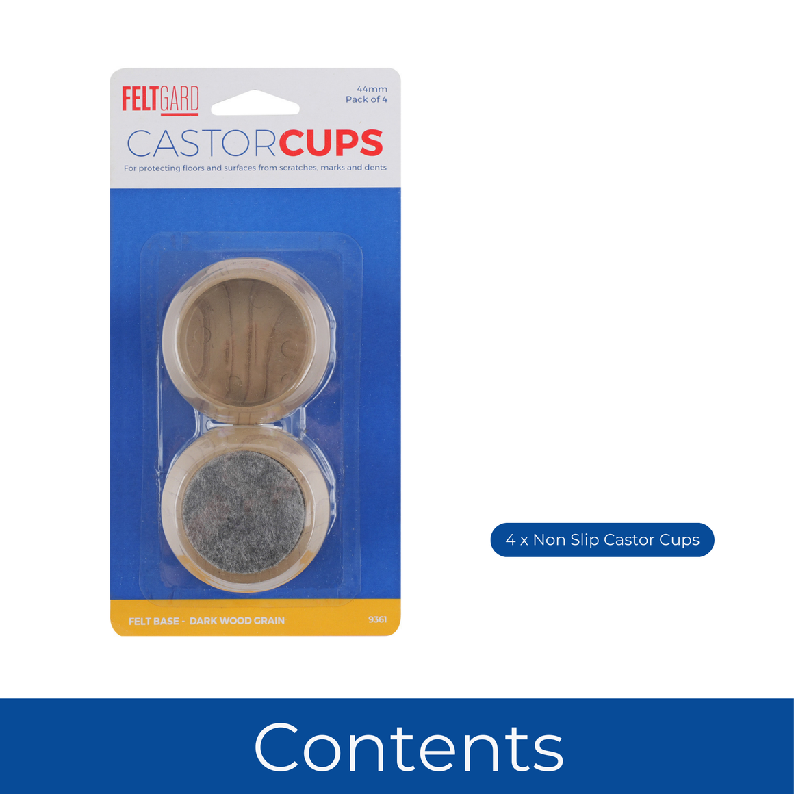 CONTENTS - Includes 4 round 44mm castor cups with a stylish dark wood grain finish, designed to complement your furniture.