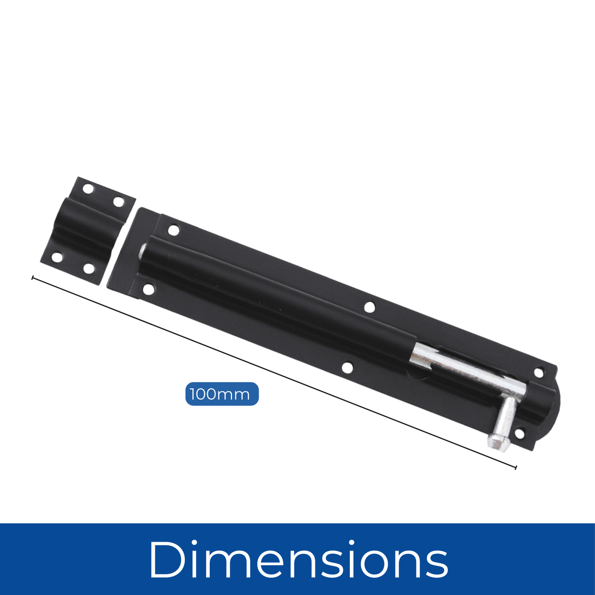 DIMENSIONS - 4-inch (100mm) heavy-duty tower bolt, designed with robust construction for superior strength and durability. Ideal for securing doors, gates, and other fixtures, its solid build ensures long-lasting performance and reliable operation in both indoor and outdoor applications. Perfect for those seeking strength and security in a compact size.
