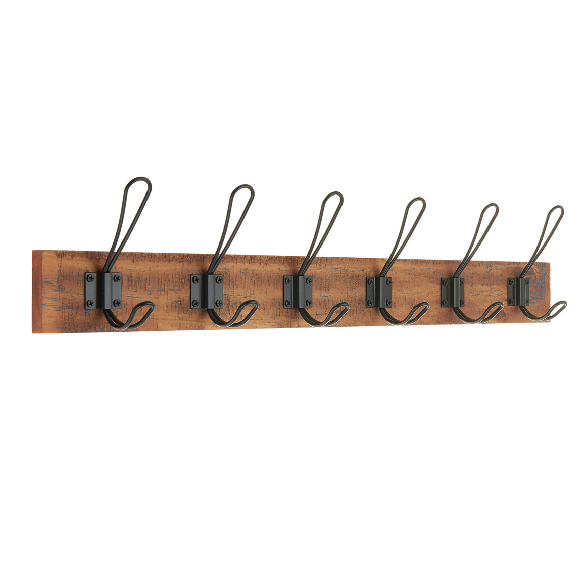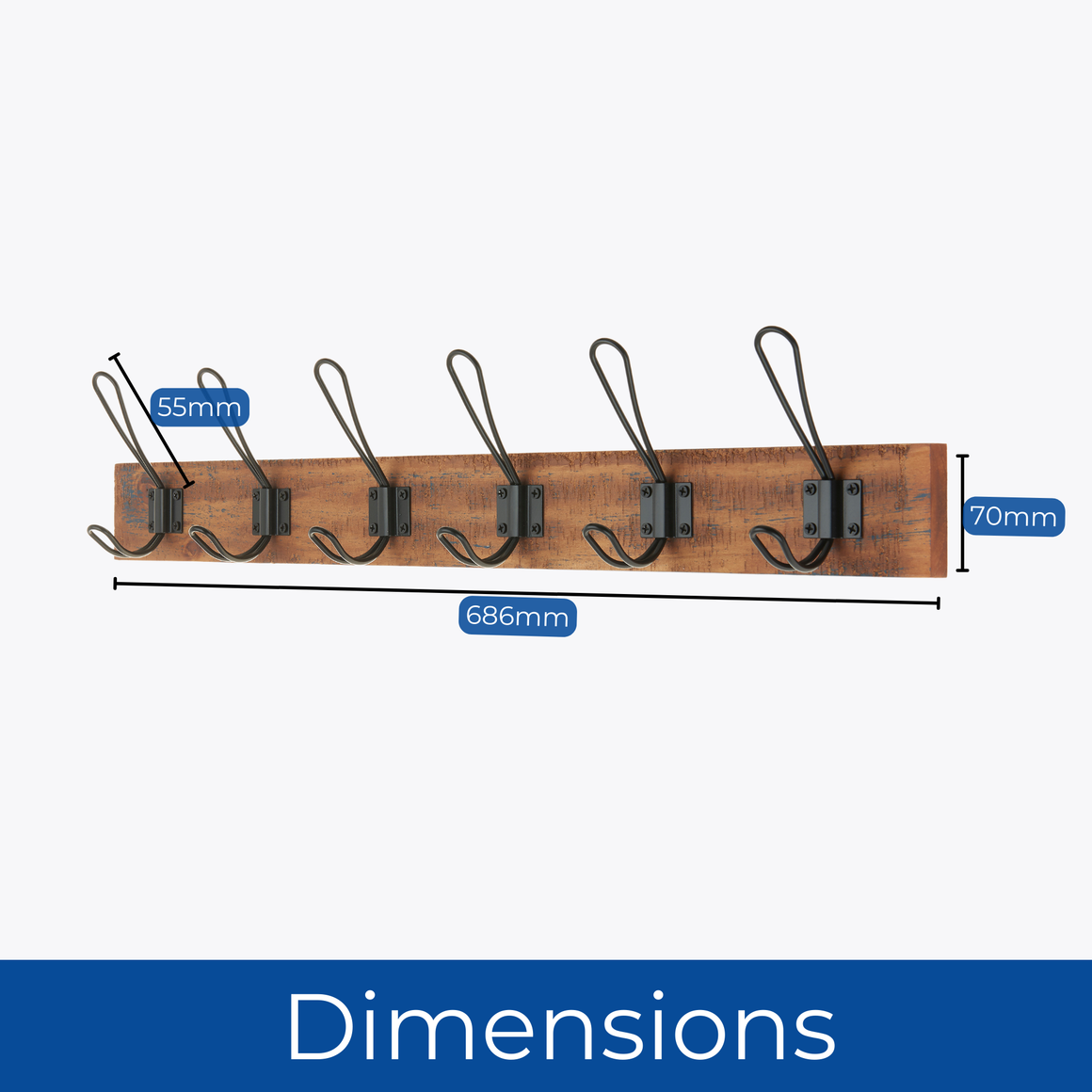 Rustic Wooden Wall Mounted Coat Rack with Black Wire Double Hooks - 6 Hooks