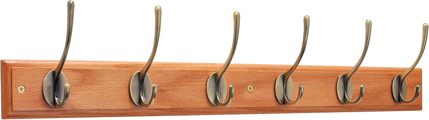Oak Effect Wall Mounted Coat Rack with Victorian Antique Brass Hooks - 6 Double Hooks