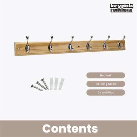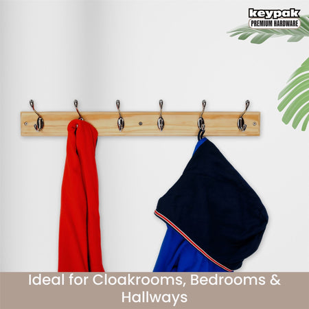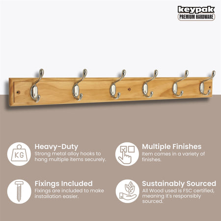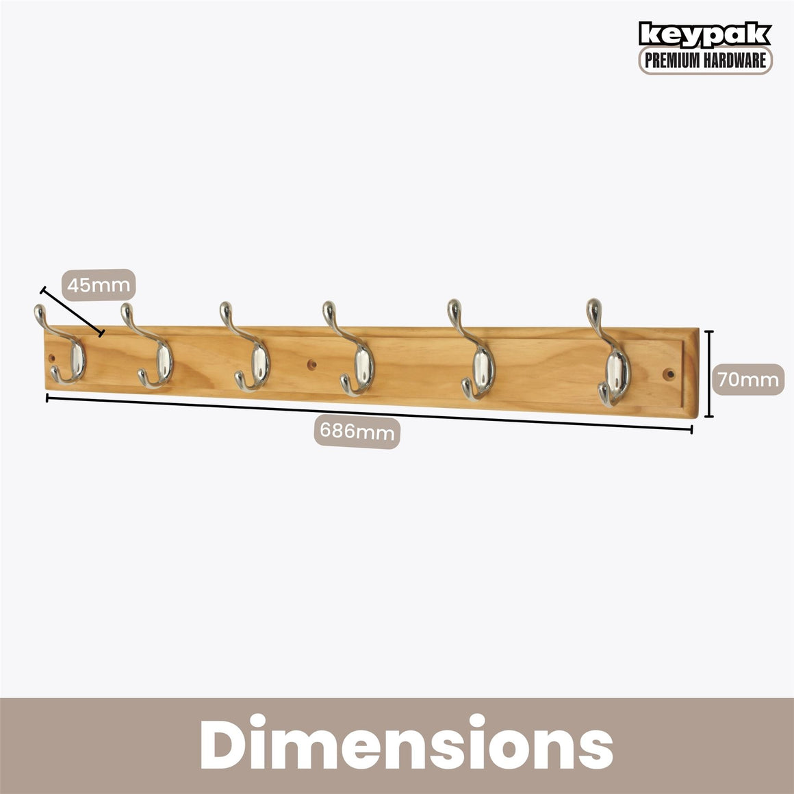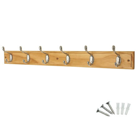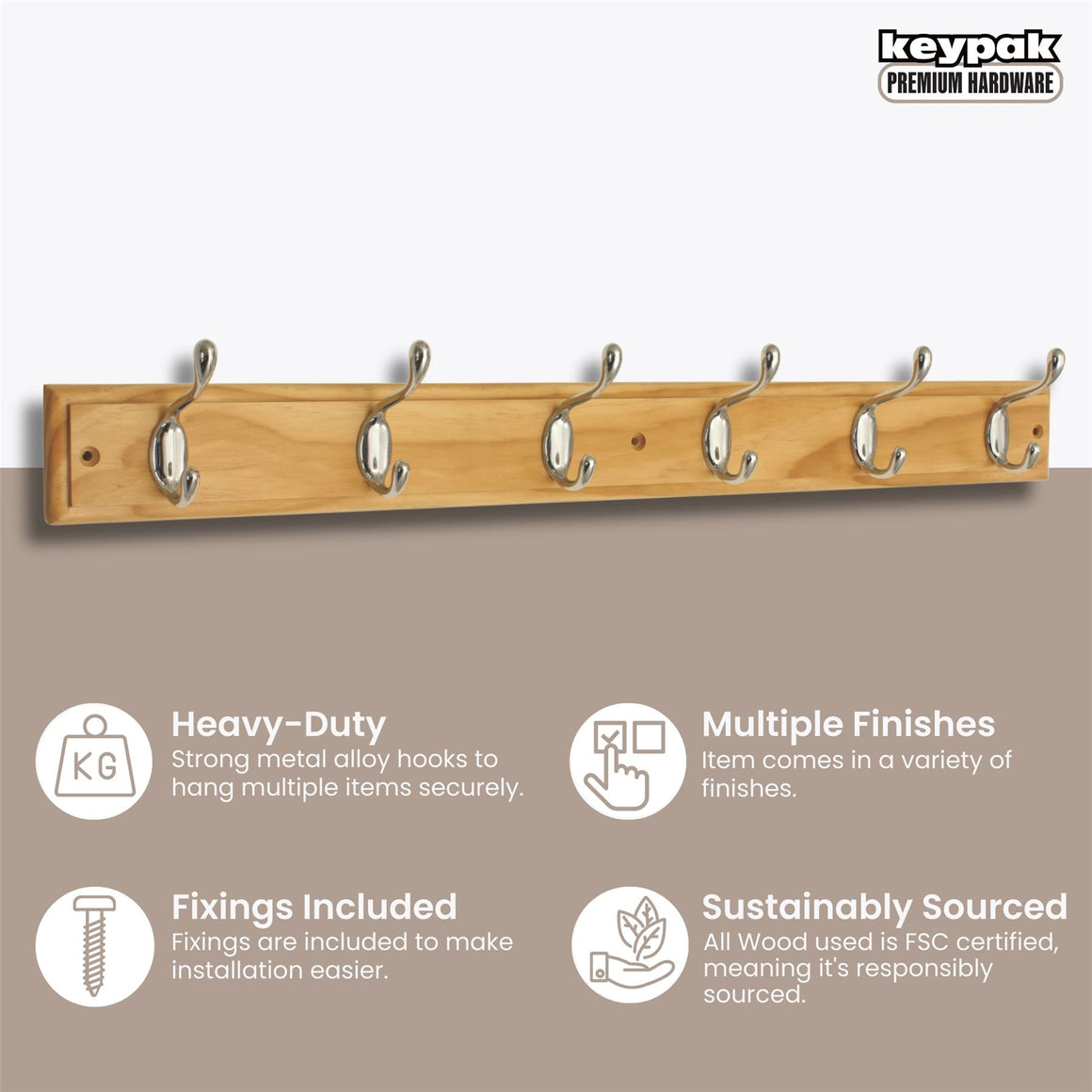 6 Polished Chrome Heavy-Duty Hooks on Pine Wooden Board