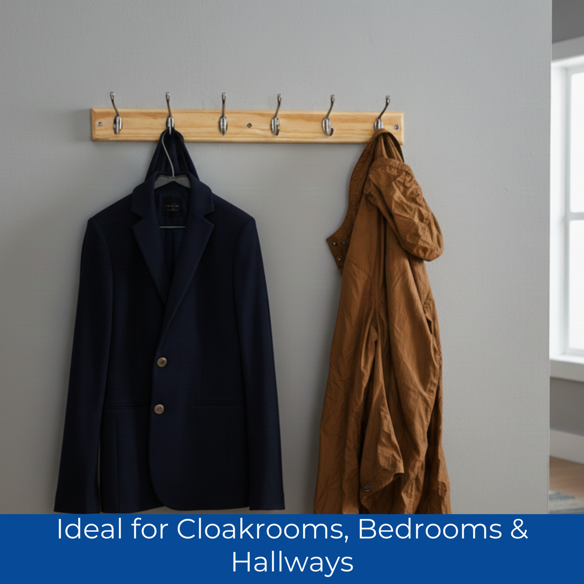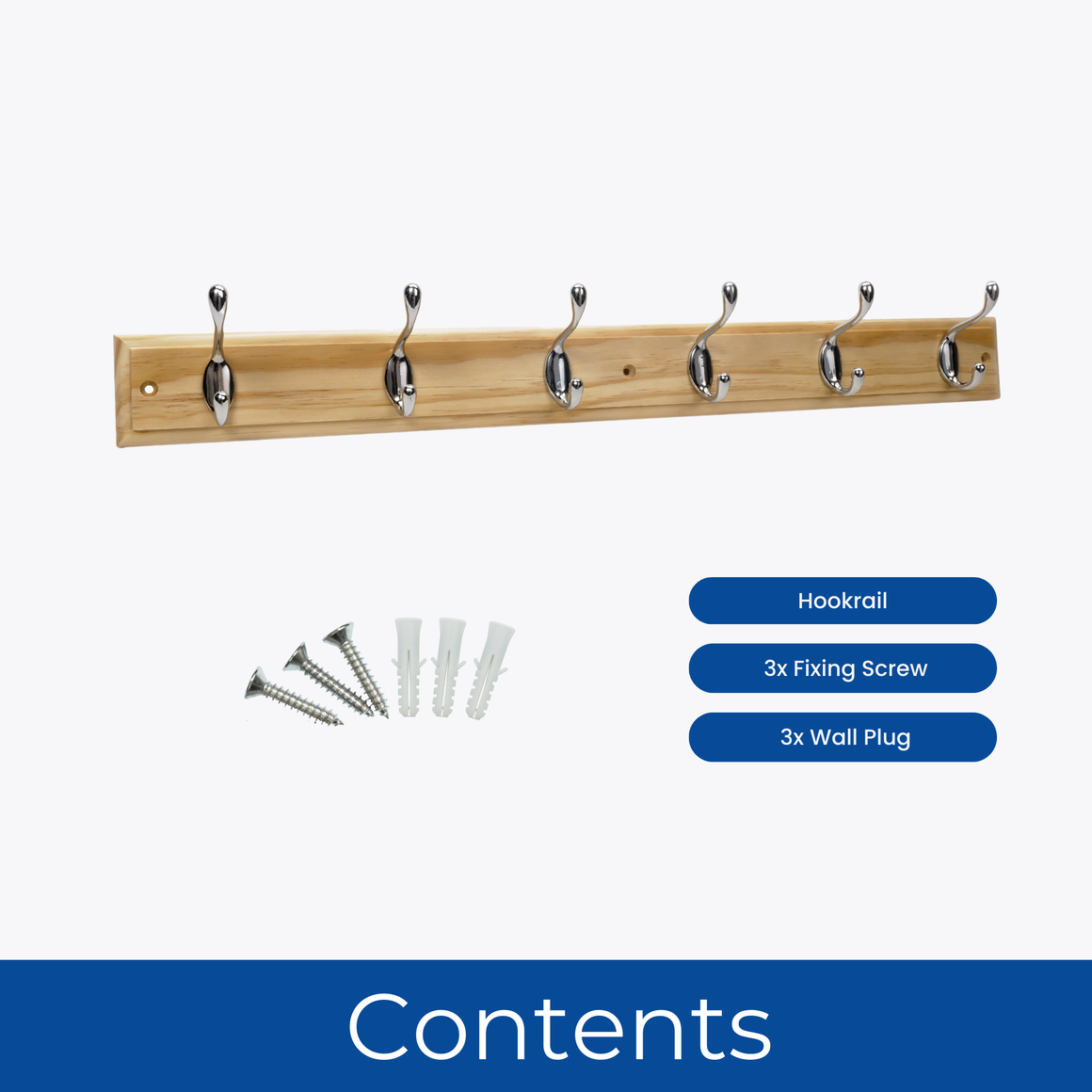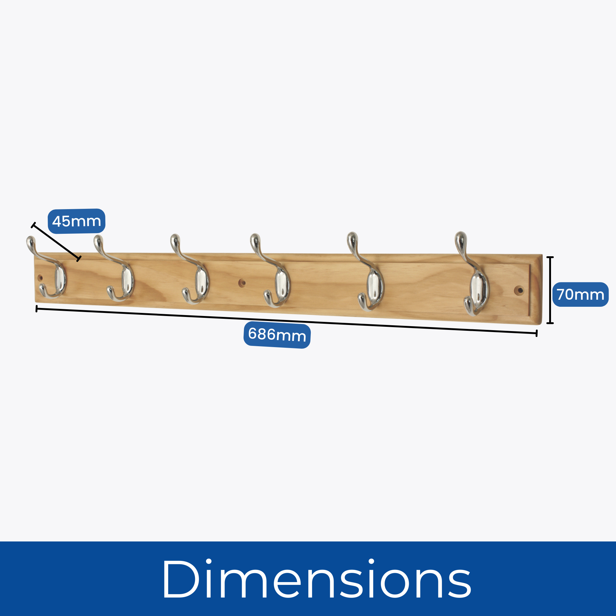 Pine Finish Wall Mounted Coat Rack with Basic Polished Chrome Double Hooks - 6 Hooks