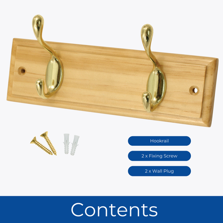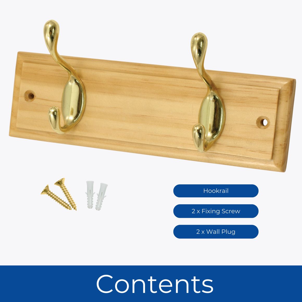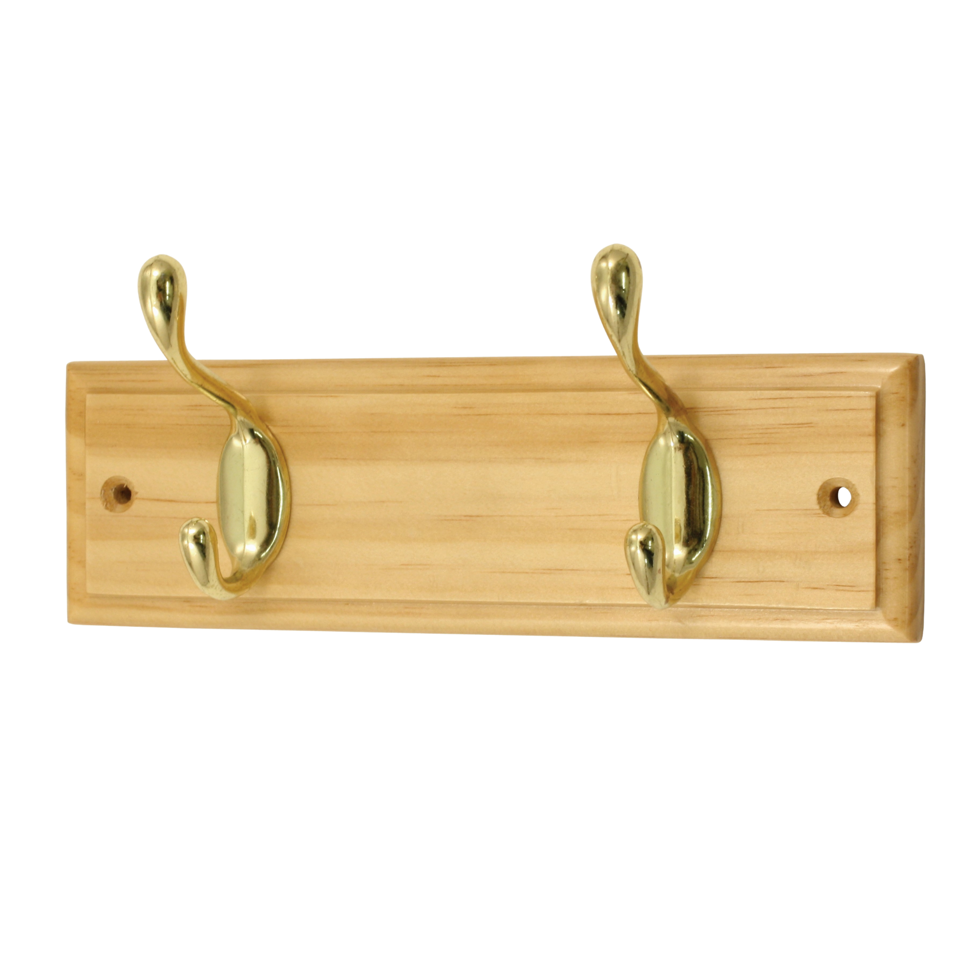 Pine Finish Wall Mounted Coat Rack with Basic Polished Brass Double Hooks - 2 Hooks