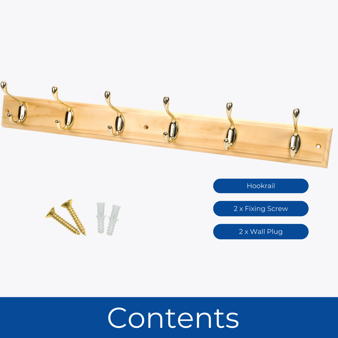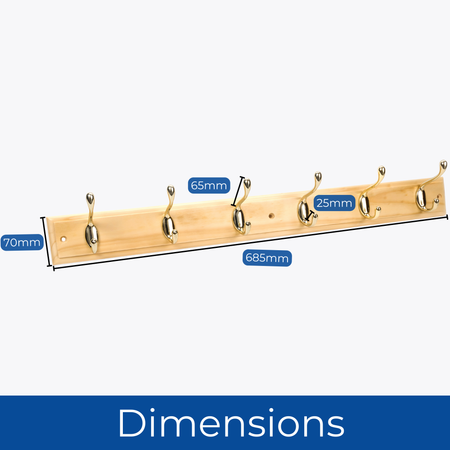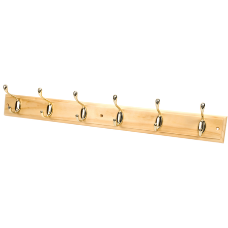 Pine Finish Wall Mounted Coat Rack with Basic Polished Brass Double Hooks - 6 Hooks