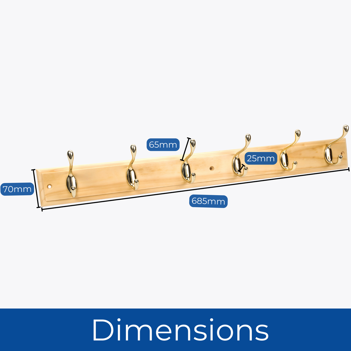DIMENSIONS - Board 68.5cm (L) x 7cm (H) x 1.6cm (D); Overall inc hooks - 68.5cm (L) x 9.5cm (H) x 7.5cm (D); Spacings - Hooks 11.2cm; Mounting Holes 32cm