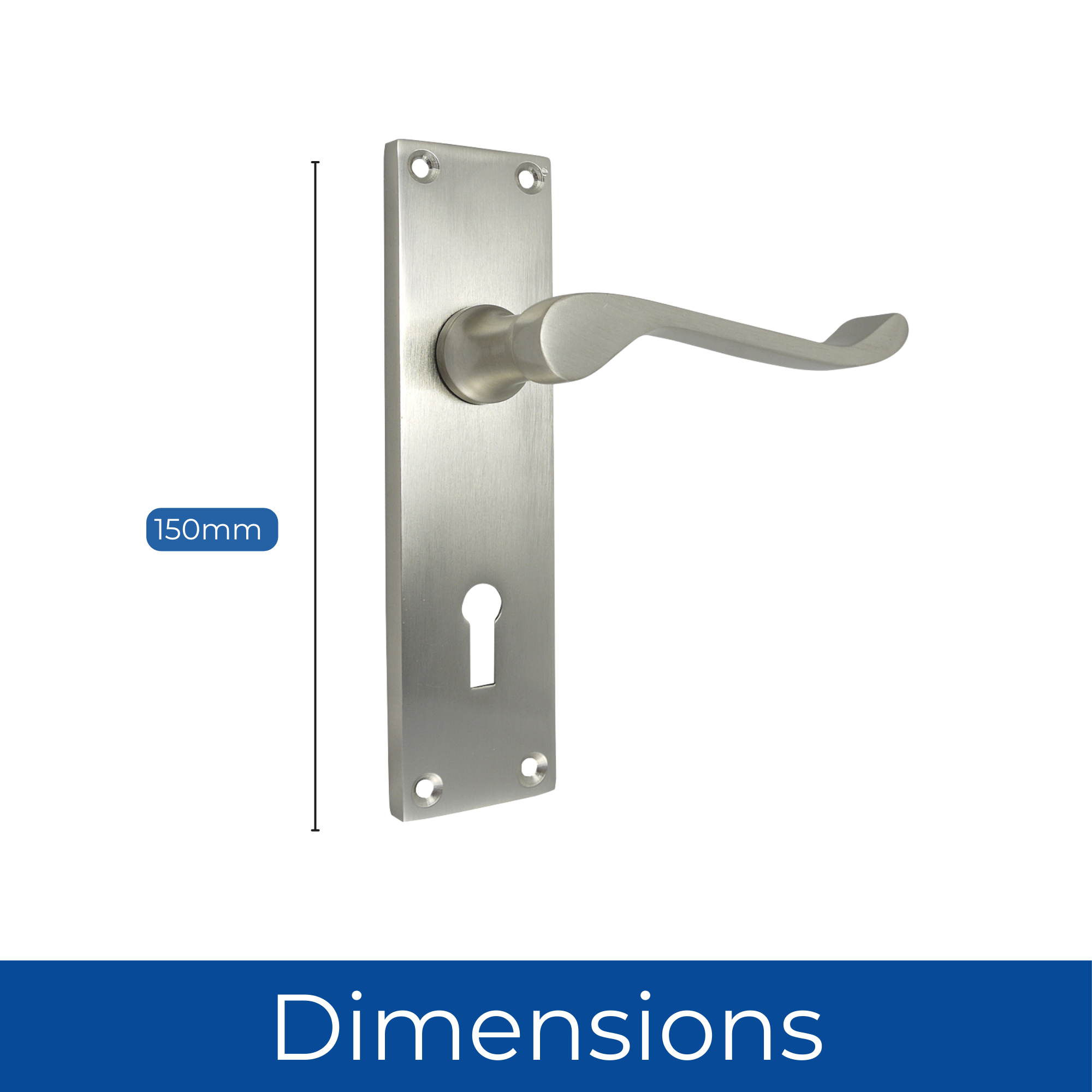 ELEGANT SCROLL LEVER DOOR HANDLES WITH SATIN CHROME FINISH FOR INTERNAL DOORS Transform your interior doors with these elegant scroll lever door handles, featuring a sophisticated satin chrome finish and a generous 150mm backplate. These handles are perfect for internal wooden doors requiring secure locking functionality while adding a touch of classic elegance to any room. VICTORIAN INSPIRED DESIGN WITH COMFORTABLE T-BAR LEVER The Victorian-inspired scroll design adds timeless charm, blending seamlessly with both traditional and contemporary interiors. The T-bar lever design offers a comfortable grip and effortless operation, making these handles suitable for all types of internal wooden doors, including bedrooms, bathrooms, and living spaces. COMPLETE SET WITH NECESSARY FITTINGS FOR STRAIGHTFORWARD INSTALLATION Each pair comes complete with all necessary fittings, including the spindle and fixing screws, ensuring a hassle-free installation. The pre-drilled holes make fitting these handles quick and easy, so you can enjoy their stylish and secure design in no time. ROBUST CONSTRUCTION FOR SMOOTH OPERATION AND DURABILITY These handles are robustly constructed to withstand regular use, ensuring smooth operation every time you open or close the door. The high-quality design ensures reliable durability, making these handles perfect for high-traffic areas. CONTEMPORARY LOOK WITH PRACTICAL SECURITY The satin chrome finish provides a contemporary look that complements a wide range of interior styles, while the secure locking functionality offers peace of mind for privacy-sensitive spaces. Whether you're renovating your home or replacing old handles, these handles offer the perfect combination of practical security and aesthetic appeal. IDEAL FOR HOME IMPROVEMENT PROJECTS These handles are an excellent choice for home improvement projects, offering both practical security features and a sophisticated design. They are suitable for DIY enthusiasts and professionals alike, ensuring a high-quality finish for any internal door installation.