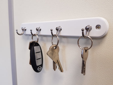 WALL-MOUNTED KEY HANGER – Designed to organise and de-clutter your living or work space of smaller items. The 4 cup shaped hooks allow for smaller items to be stored, such as keys, tea towels or necklaces.
