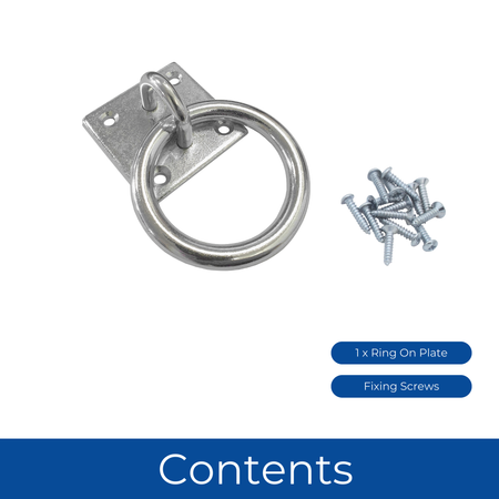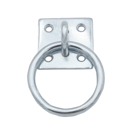 This heavy-duty galvanised zinc ring on plate is a durable and versatile hardware solution for various anchoring needs. The 50mm ring provides a secure attachment point for chains, tethers, and ropes, making it ideal for equestrian applications, decking, and general outdoor use. Crafted to withstand the elements, this rust-proof fixture ensures long-lasting performance, even in demanding environments. Included in the set are four pre-drilled holes and mounting screws for straightforward installation, allowing for quick and easy setup. The sturdy construction guarantees reliable performance, whether used as a horse tie-up ring in stables or as a secure anchor point for general tethering purposes. The zinc galvanised finish offers excellent resistance to corrosion, ensuring longevity even in harsh weather conditions. The thoughtfully designed plate provides stable support for the ring, ensuring secure and reliable anchoring. Perfect for both domestic and commercial applications, this anchor solution is ideal for a wide range of tethering and fastening tasks. Installation is hassle-free with the included fixings, making it an excellent choice for anyone in need of a dependable anchoring solution.