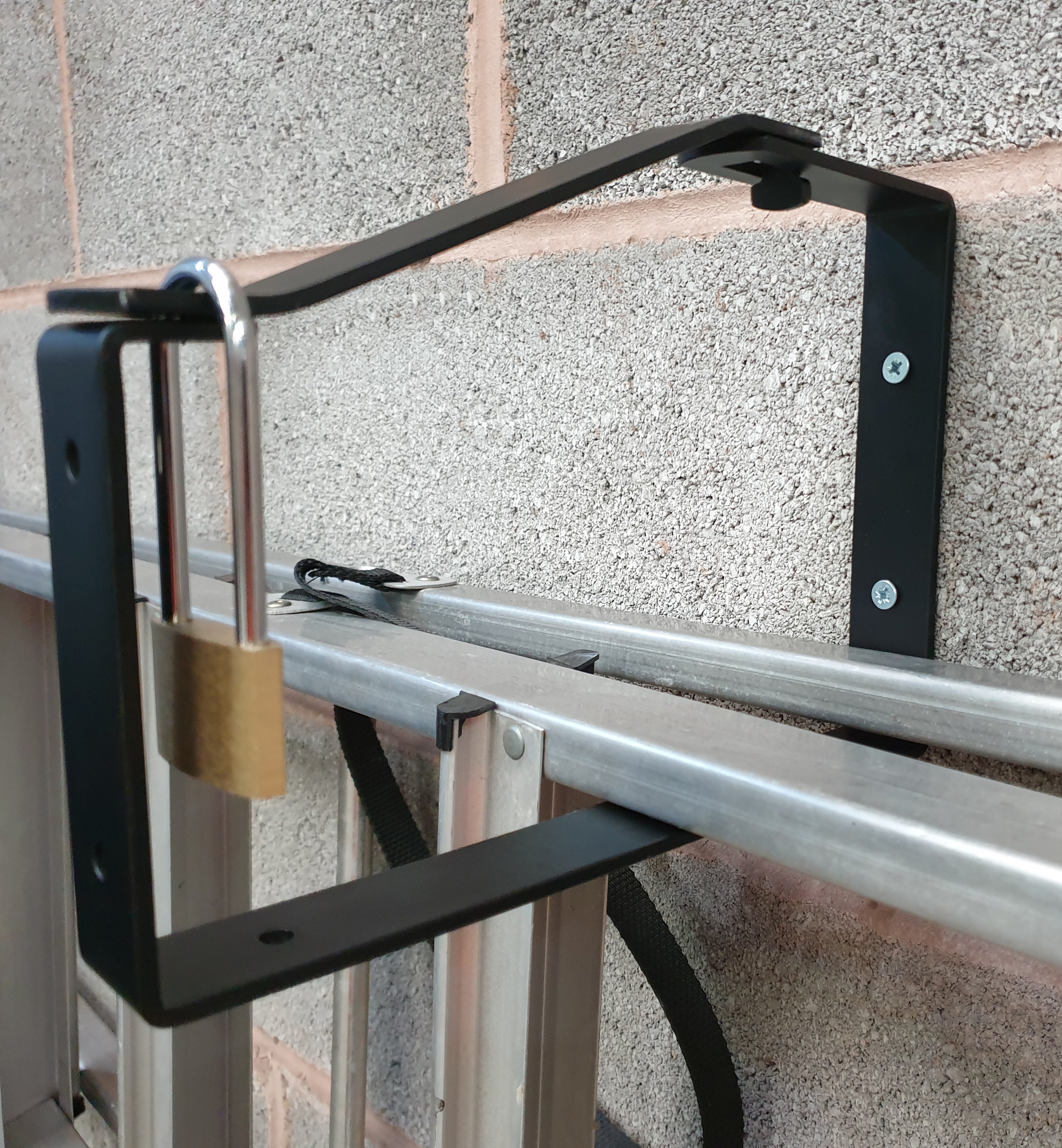 CONTENTS - 2x Lockable Ladder Brackets (Padlock & screws not included)