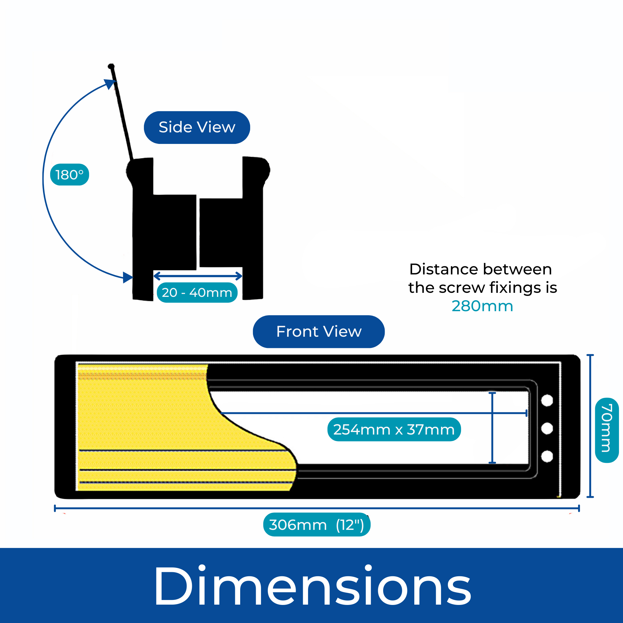 DIMENSIONS – The letter box overall size is 306mm x 70mm and the internal dimension of the sleeve is 254mm x 37mm. The distance between the screw hole centres is 275mm.