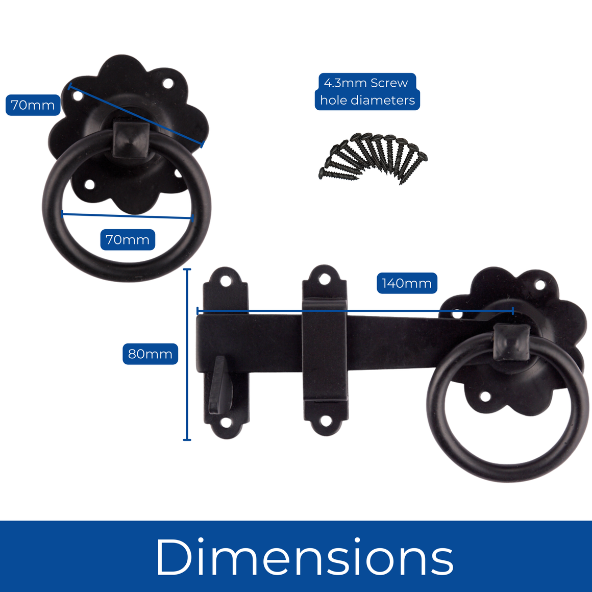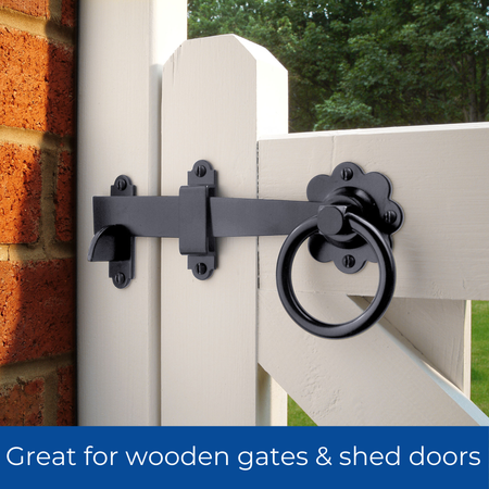 DIMENSIONS - 152mm (6\") Ring gate latch – ideal for standard garden gates, wooden shed doors, and outdoor entryways, providing a secure and sturdy fit.