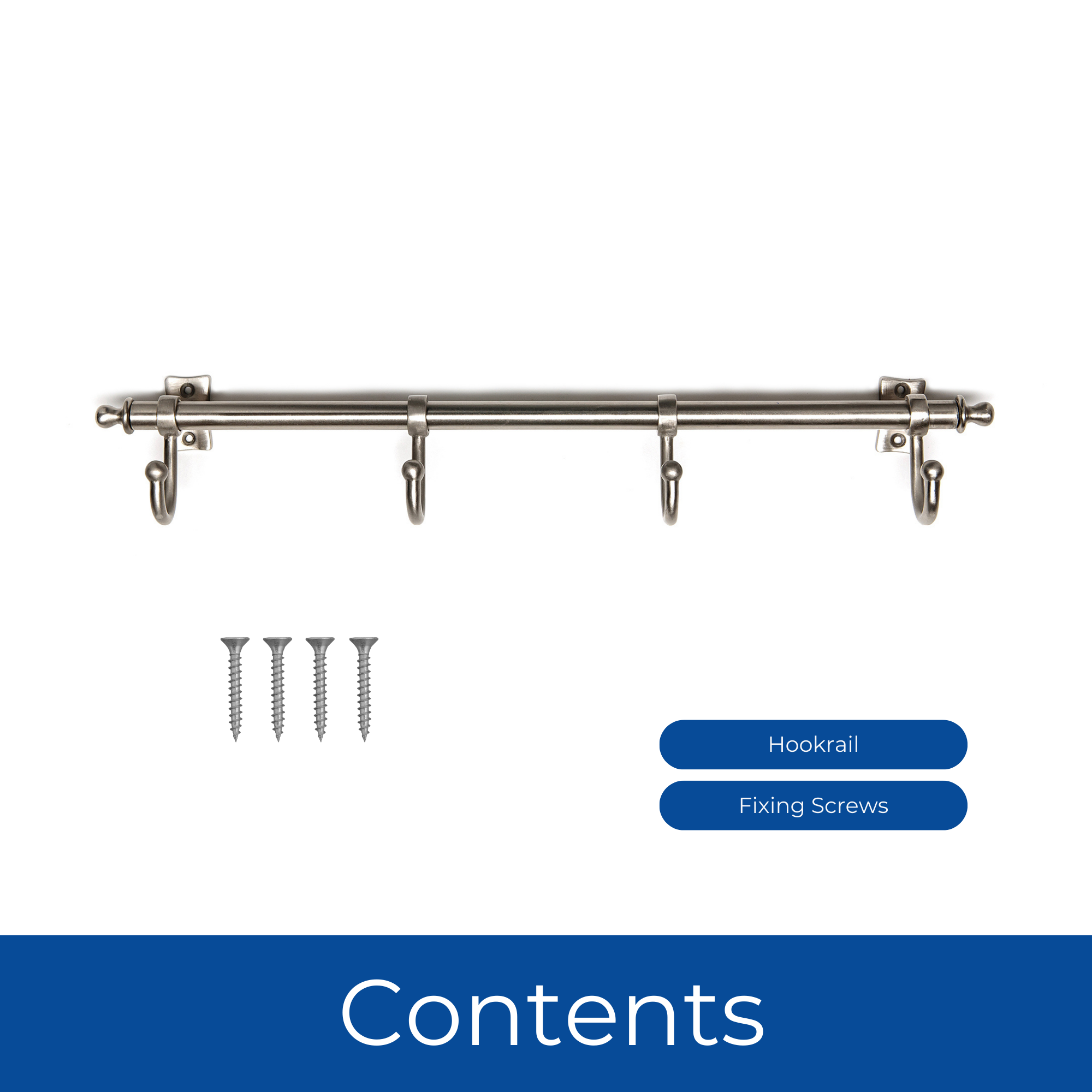Tidy up your kitchen and reclaim valuable counter space with the Hookrail 4-Hook Wall Mounted Kitchen Rail in Satin Nickel. This stylish and functional wall-mounted utensil rail is the perfect solution for kitchens, utility rooms, and even bathrooms, helping you keep everything organised and within easy reach. Made from high-quality, all-metal materials, the 49cm hanging rail features four robust metal hooks – ideal for hanging coffee mugs, cooking utensils, dish towels, cutting boards, and more. Its sleek satin nickel finish complements any modern or contemporary kitchen décor, adding both style and convenience to your walls. Designed for effortless setup, the Hookrail comes with all necessary wall fixings and mounting hardware, so you can install it right out of the box. Whether you're looking to create more storage in a small kitchen or add functional charm to your workspace, this multi-purpose hanging rail is a smart, space-saving solution.