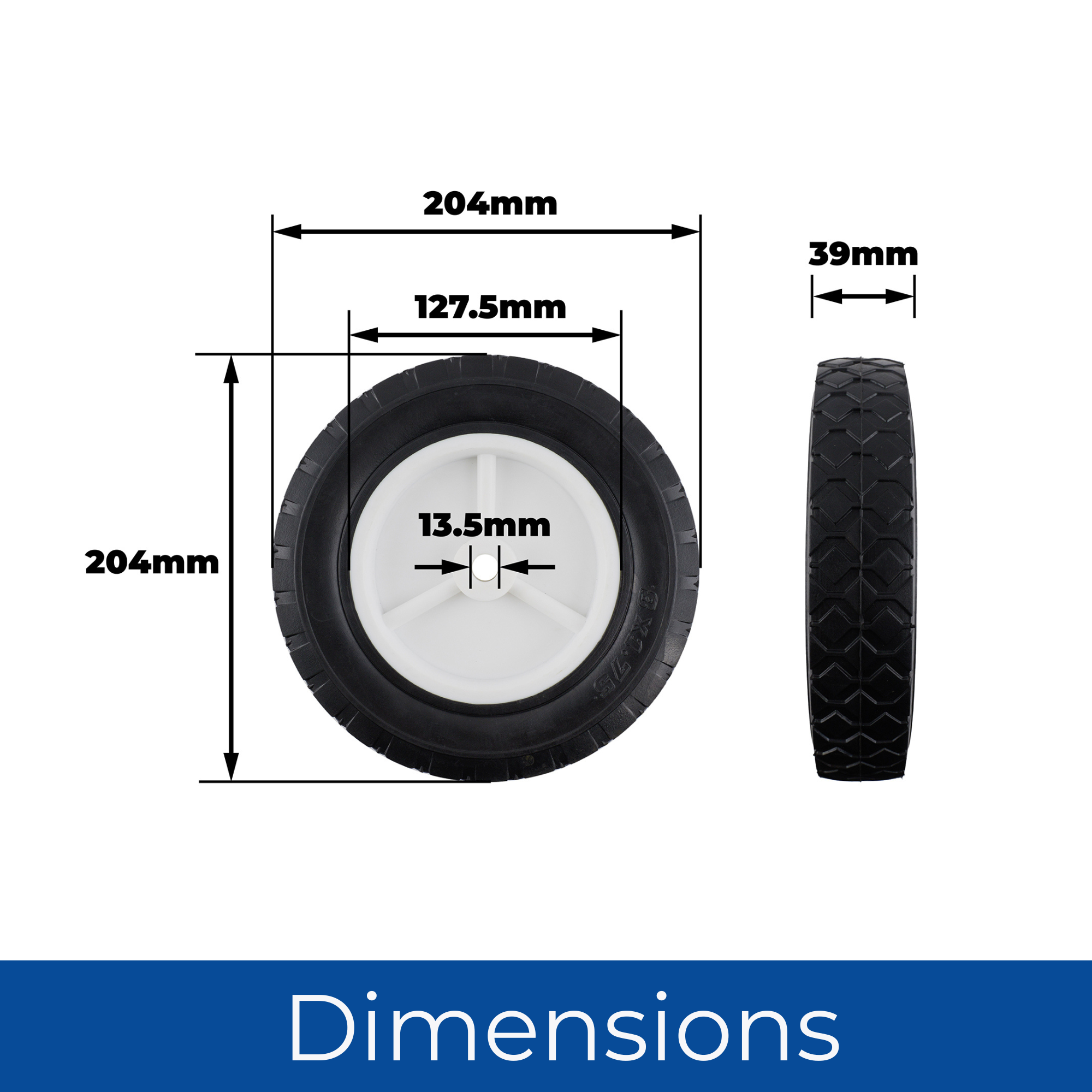 Puncture-Proof Tyre 200mm, Semi-Pneumatic Rubber, White Plastic Hub