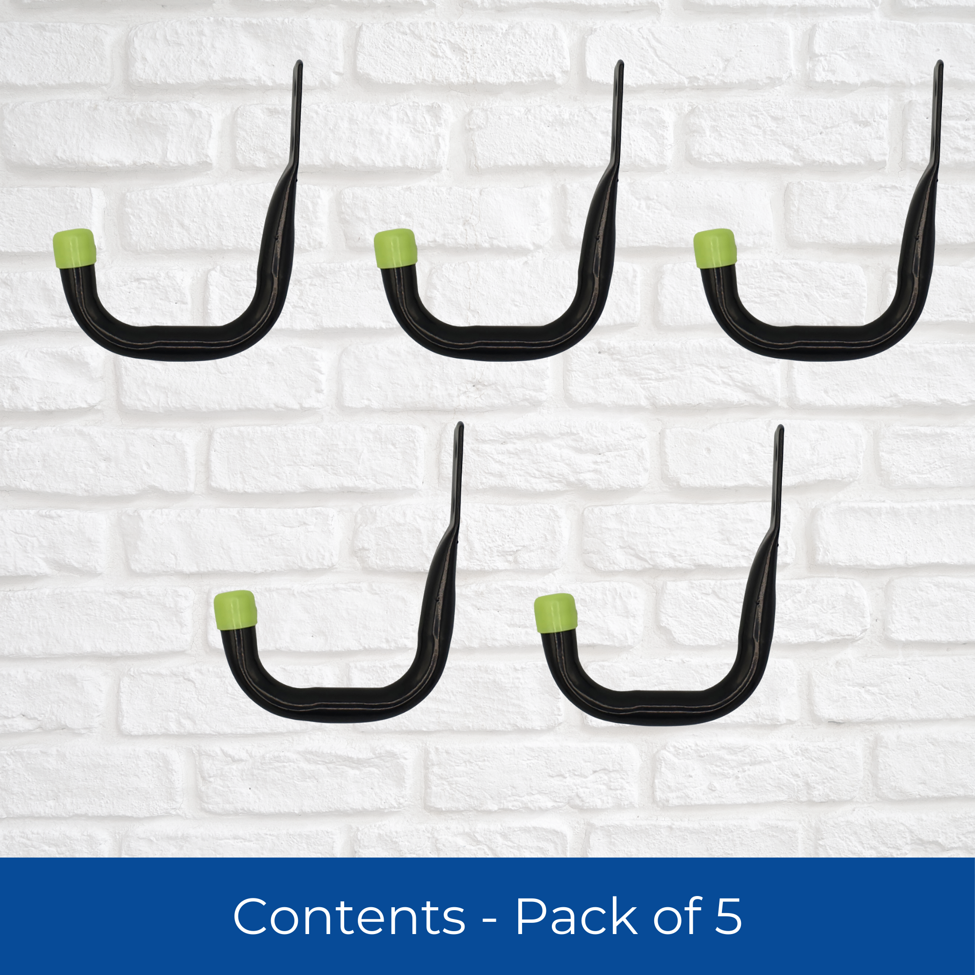SET OF 5 HEAVY-DUTY WALL HOOKS, perfect for organising lawn mowers, bikes, hoses, tools, and other outdoor items.