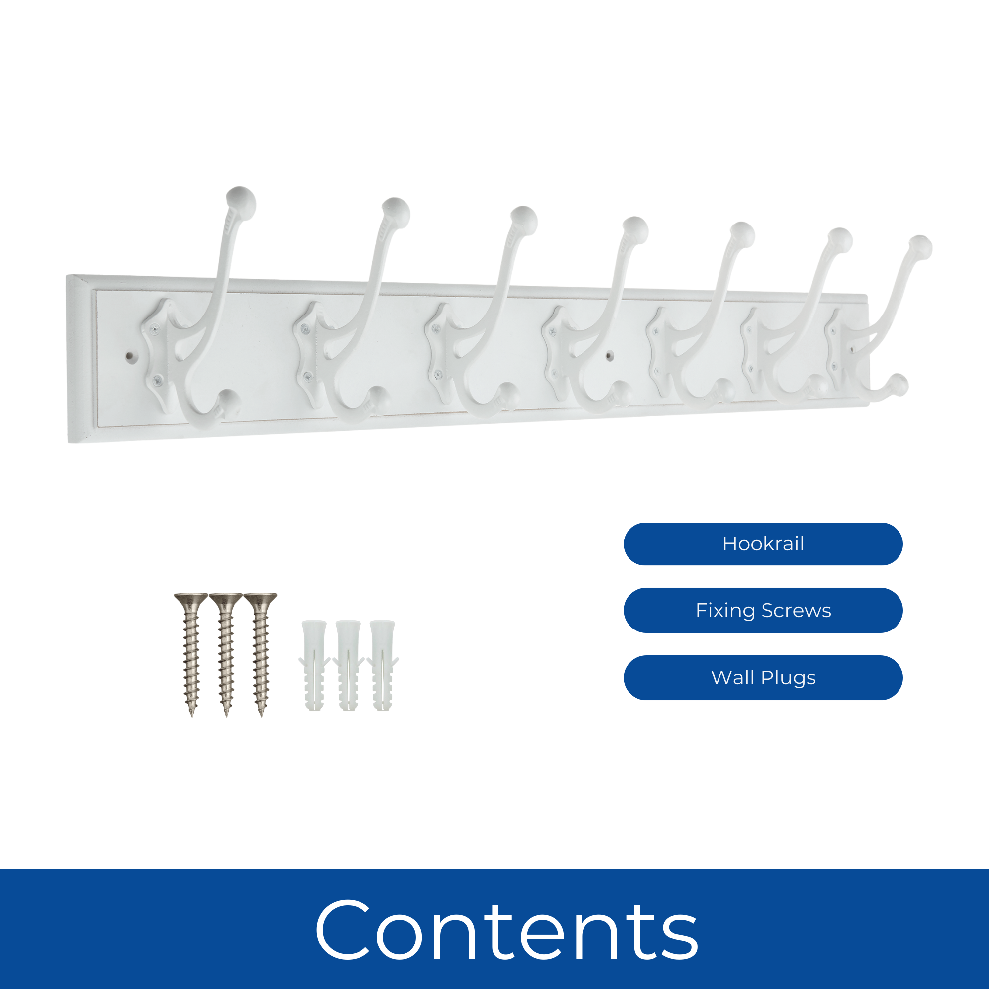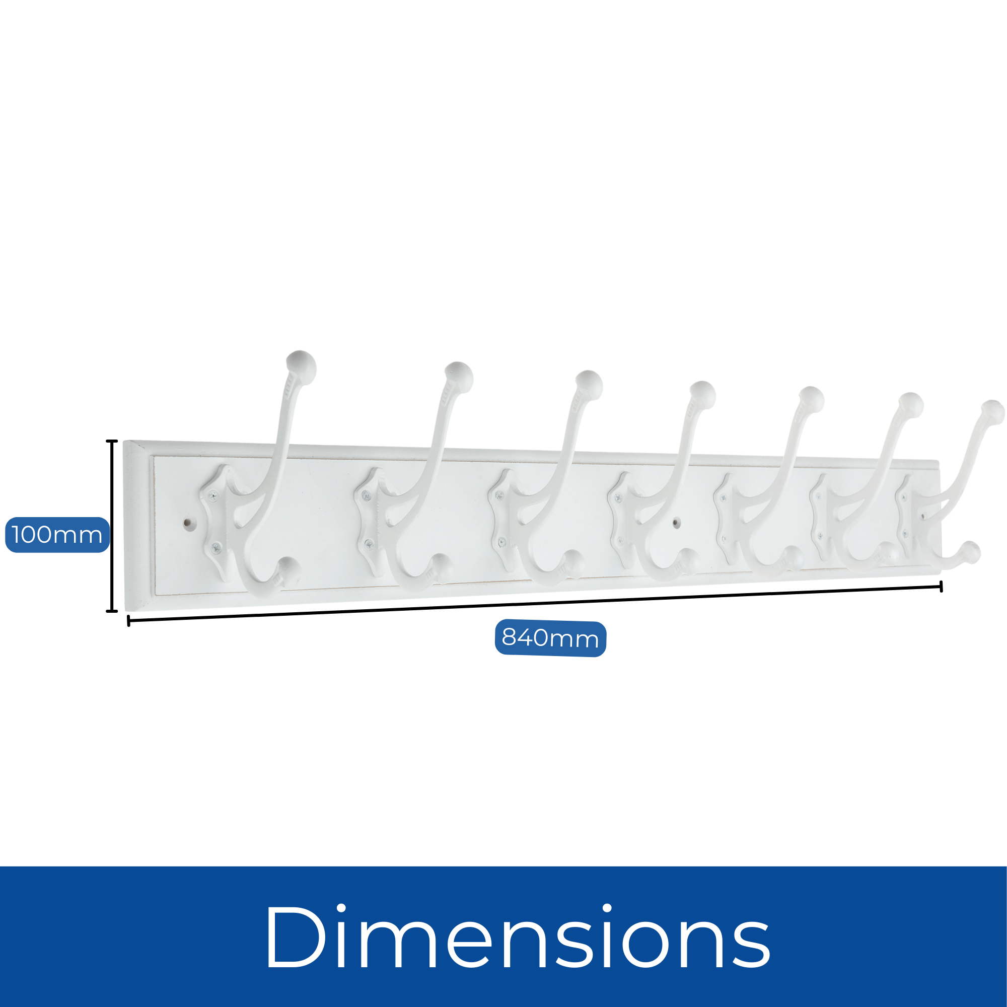 Organise your space with timeless character using the Keypak 7 Double Hook Coat Rack, crafted with a rustic wooden board and finished with antique white metal hooks. Measuring 84cm wide by 10cm high, this wall-mounted rack brings elegant organisation to any hallway, bedroom, or utility area. The double hooks provide ample hanging space for robes, coats, towels, and accessories, making it an ideal solution for homes seeking both style and function. The board is made from solid wood with a classic finish that complements traditional and country-inspired interiors. Each double hook is securely fixed, offering durable support for heavier garments or bags. Whether mounted in an entryway or behind a bedroom door, it turns unused wall space into a practical storage feature. The rack includes all fixings for straightforward installation. Keypak’s commitment to quality design ensures this product delivers durability, ease of use, and a cohesive aesthetic that suits a wide range of rooms.