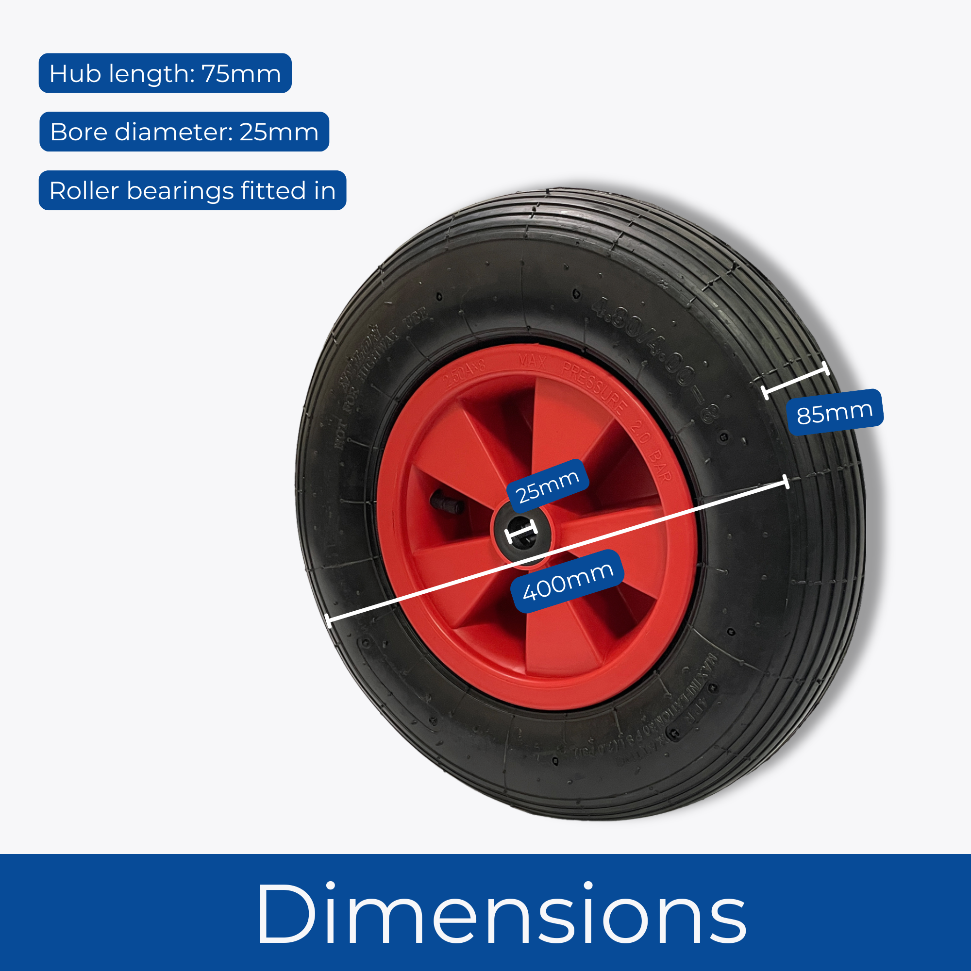 Wheelbarrow Pneumatic Wheel 40cm (16 inch) with 25mm Roller Bearing and Plastic Hub