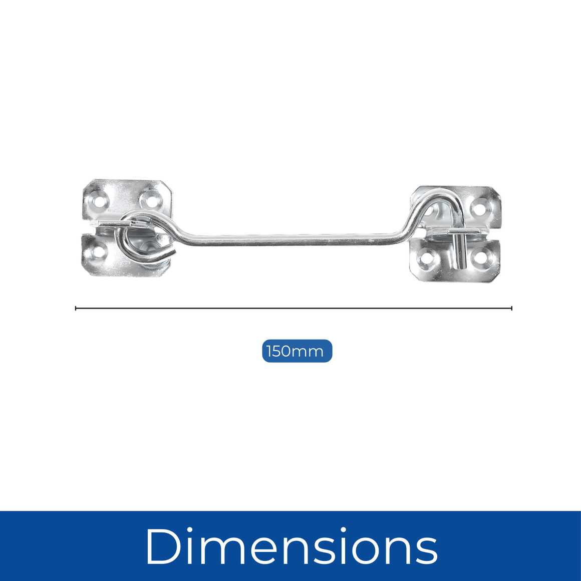 DIMENSIONS - 150mm (6-inch) heavy-duty wire cabin hook and eye latch, perfect for securing doors, gates, and garden sheds. Its sturdy construction ensures reliable fastening, offering enhanced security and stability for various indoor and outdoor applications. Ideal for both residential and commercial use.