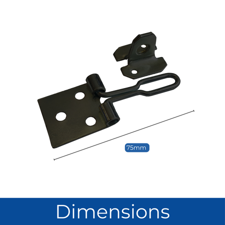DIMENSIONS - 75mm (3-inch) heavy-duty black wire hasp and staple, perfect for securing various doors and enclosures